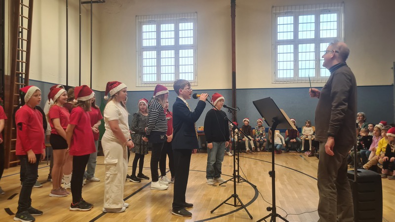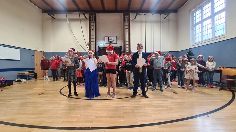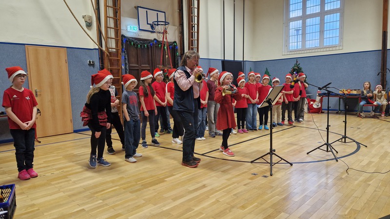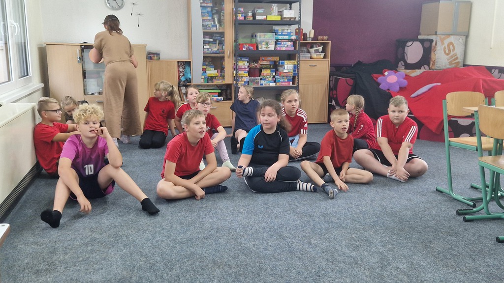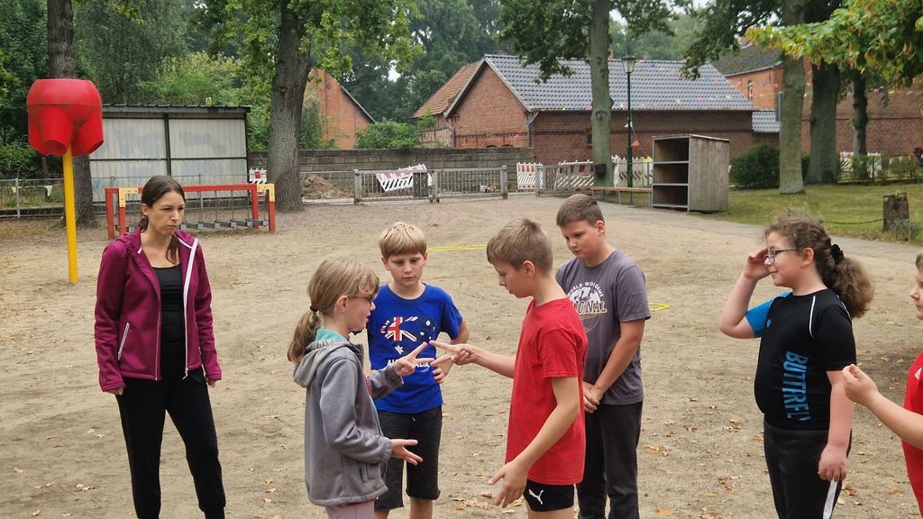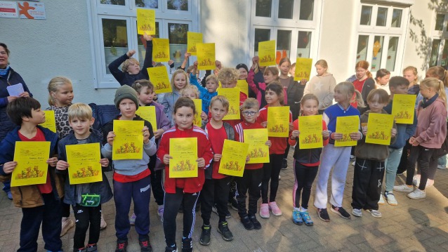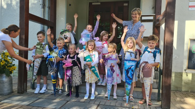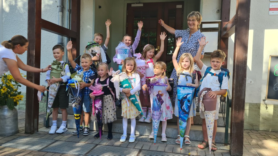 Zehn meist strahlende Gesichter blicken mit Klassenlehrerin Frau Gutsche in die Kamera. Sie alle wurden am 6.9.2025 an der Grundschule Lanz eingeschult.